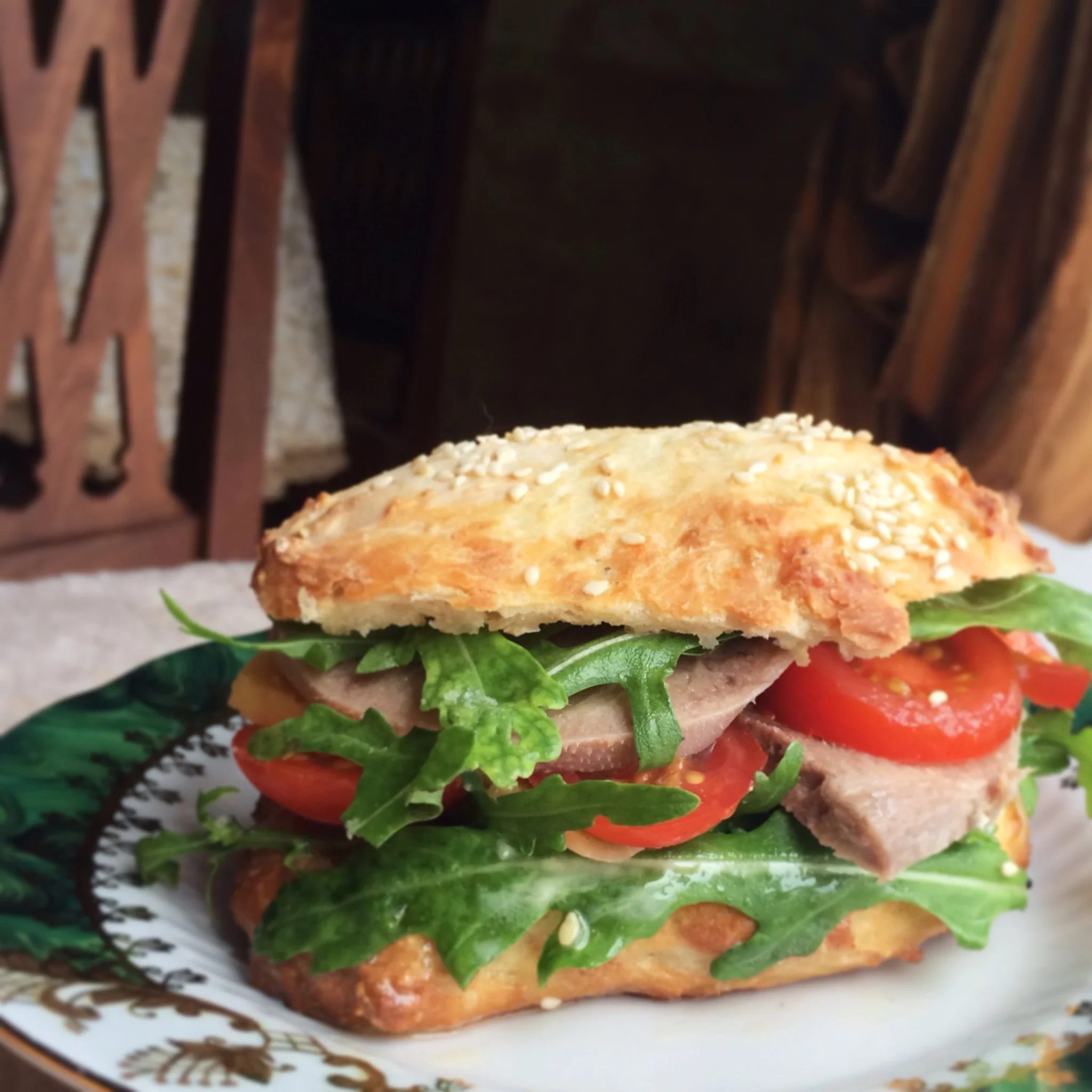ШАГ 7 Потом дайте остыть булочкам и далее готовьте свой любимый бутерброд. В моем случае это было сливочное масло, сыр, говяжий язык отварной, руккола и помидоры черри.