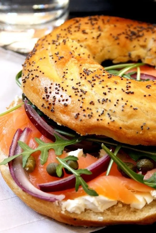 ШАГ 7 Разрезать на две части, смазать нижнюю творожным сыром, сверху выложить салат, на него — нарезанную ломтиками семгу, накрыть второй частью бейгла.