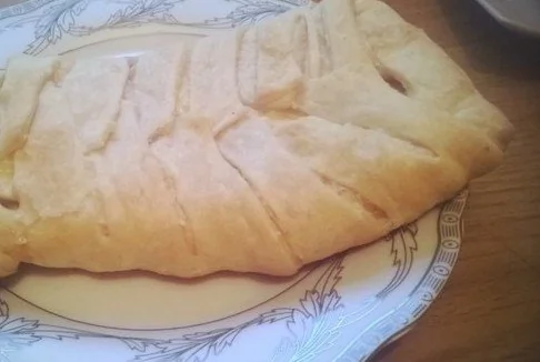 ШАГ 3 На тесте по краям сделать разрезы (получаются полоски), в центр теста выкладывать лук, затем ветчину и сыр, далее словно заплетать «ленты», нужно не в буквально смысле плести, достаточно перекрестить их между собой. Закрепить тесто по бокам, чтобы не вытек сок. Запекать не более 25 минут.