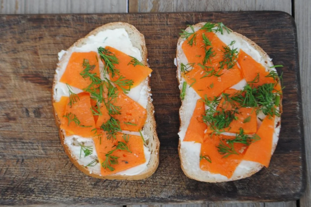 ШАГ 3 На хлеб намазать плавленый сыр, выложить тыкву, посыпать укропом. Bon appétit