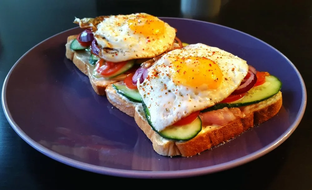 ШАГ 4 Хлеб подрумянить в тостере, смазать одну сторону тонким слоем майонеза. Затем положить сыр, бекон, огурец, помидор, лук, накрыть все глазуньей.