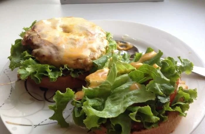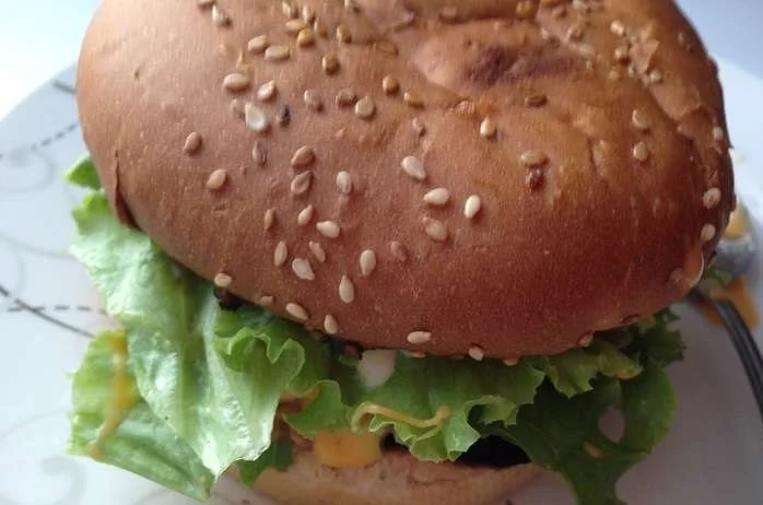 ШАГ 9 По желанию можно положить на обе стороны булочки еще по листовому салату, затем на одну из сторон положить котлетку с сыром и наконец накрыть второй стороной булочки, слегка придавить.