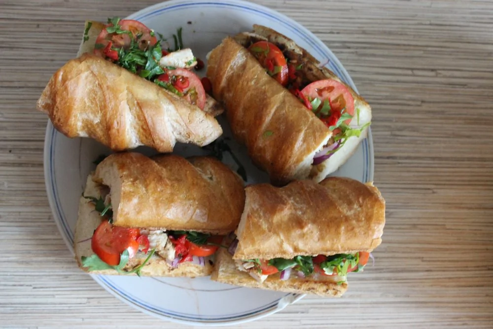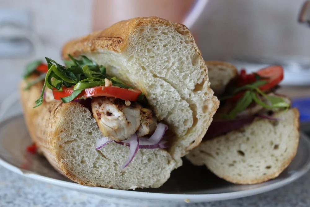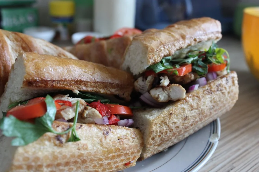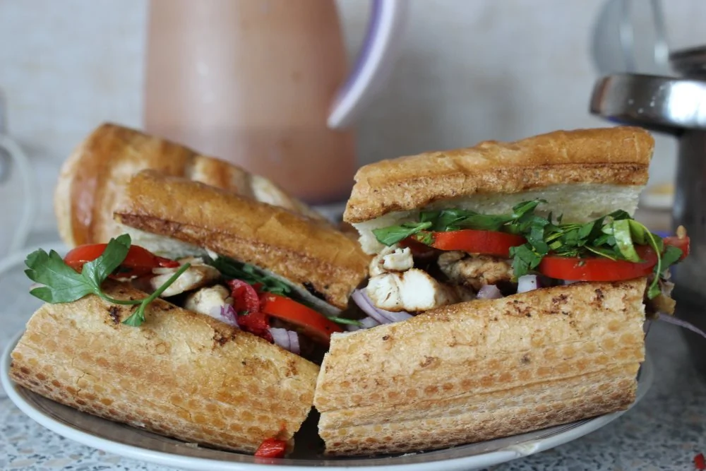 ШАГ 6 Нижнюю часть раскрытого батона смазать смесью кетчупа и горчицы. Уложить туда маринованный лук, курицу и помидоры. Посыпать сверху петрушку и чили. Закрыть верхней частью, придавить, готово.