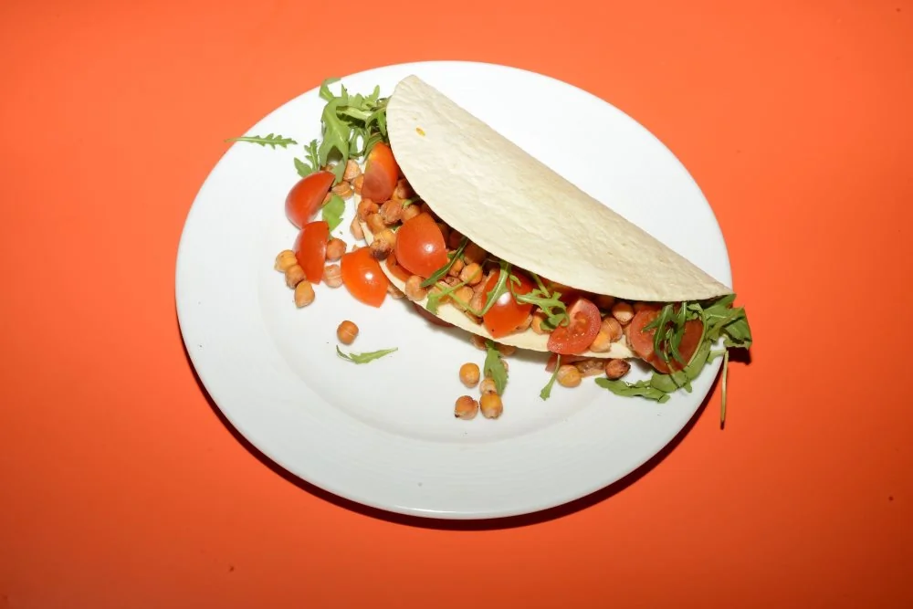 ШАГ 5 В лепешки для тако положить нут, а сверху рукколу и нарезанный кубиками помидор.