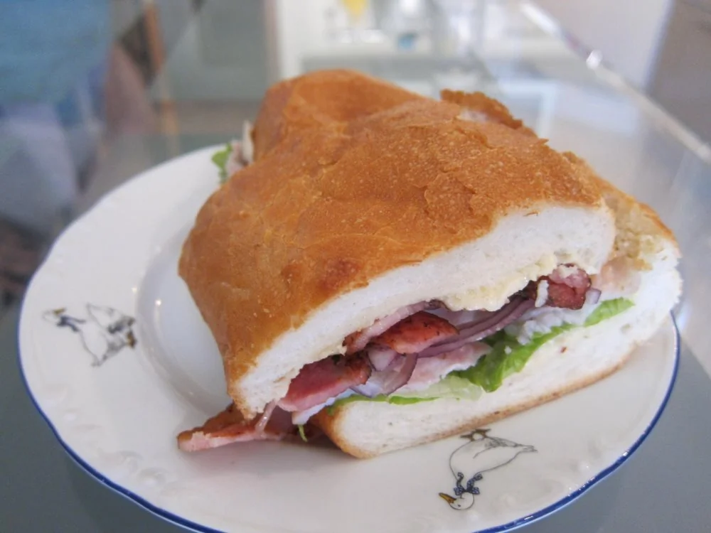 ШАГ 5 Нанести на половинки чиабатты полученный соус. Далее листы салата, корейка, лук, бекон и сыр.
