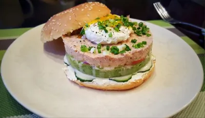 ШАГ 7 Сборка: на нижнюю часть булочки намазать творожный сыр. Затем положить кружочки огурца. Далее выкладываем гуакамоле (я использовала круглую железную форму для выкладки гарниров/салатов), затем выкладываем помидоры, посыпаем красным луком, и выкладываем тунец.