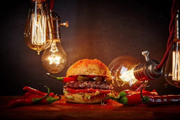 ШАГ 4 Булочку разрезать пополам. На верхнюю и нижнюю часть булочки намазать слой кетчупа. Выложить на нижнюю часть булочки ломтики томата, кольца красного лука, котлету, маринованный перец халапеньо. В последнюю очередь выложить перец чили, накрыть верхней частью булочки. Булочку сверху посыпать сладкой паприкой.