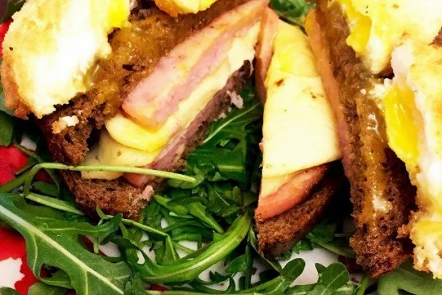 ШАГ 5 Собираем наши сэндвичи. Достаем из духовки наши тосты с сыром, кладем внутрь ветчину, сверху кладем яйца Пашот в панировке. Украшаем салатными листьями.