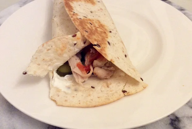 ШАГ 4 Свернуть лепешку, начиная с нижнего края, и далее загнуть края. Для удобства скрепить зубочисткой.