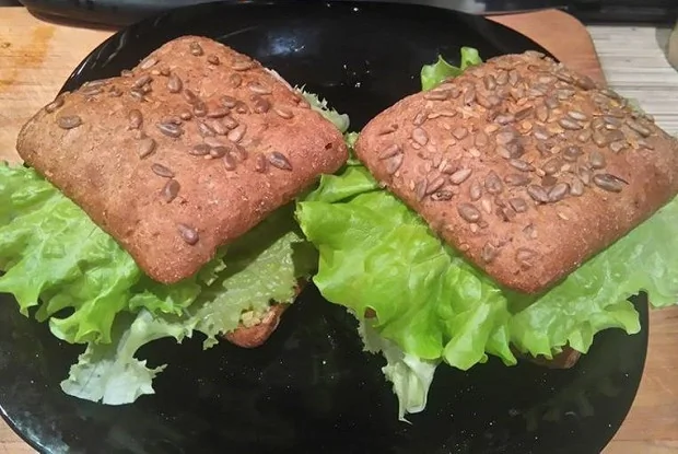 ШАГ 4 Булочки разделить пополам, нижнюю часть смазать пастой из авокадо, сверху положить лист салата, на него филе лосося, еще один лист салата и верхнюю часть булочки.