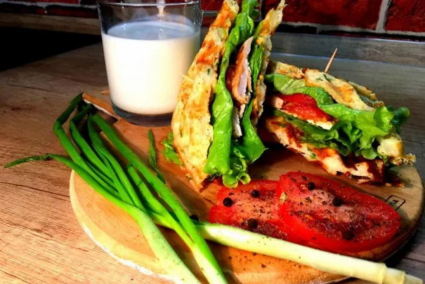 ШАГ 8 Собрать сэндвич: полить вафлю соусом, сверху выложить курицу, салат и помидор, еще раз салат обильно полить соусом и накрыть сверху вафлей.
