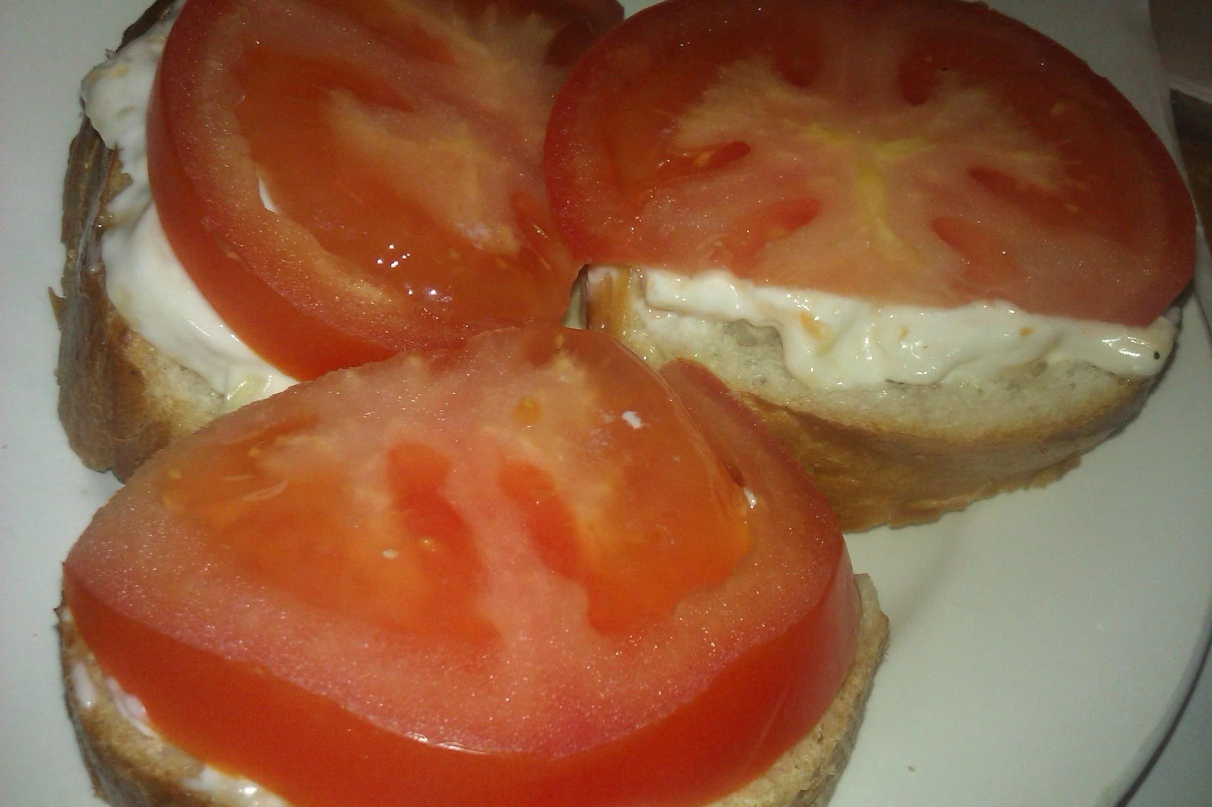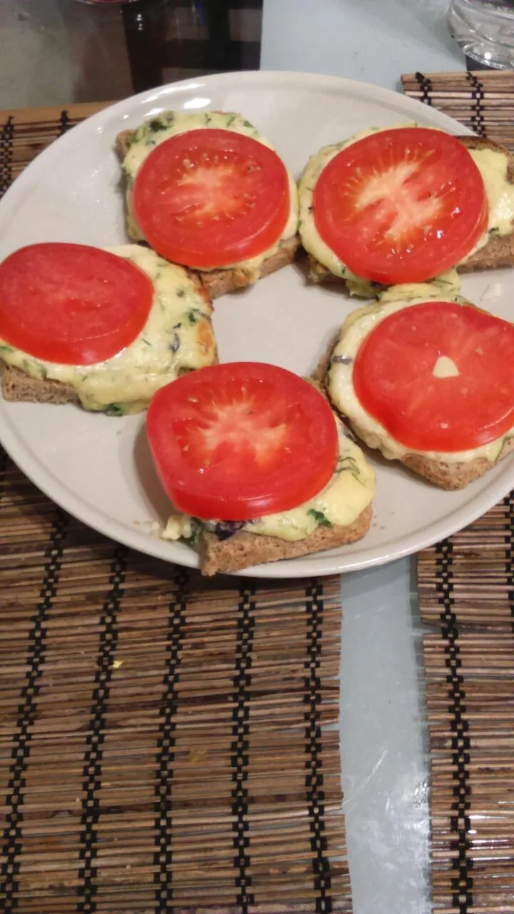ШАГ 2 Сыр, измельченный чеснок и майонез перемешать, чтобы получилась довольно густая масса, выложить на хлеб, сверху поместить тонкий кружочек помидора.