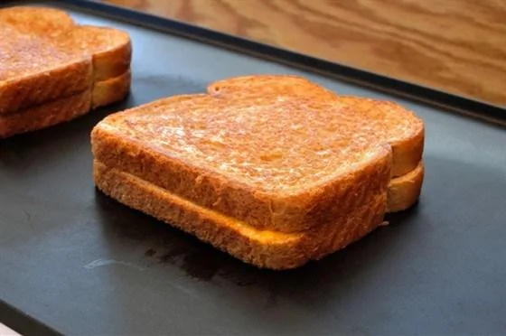 ШАГ 2 Порезать сыр на кусочки и положить на не намазанную маслом сторону хлеба. Сверху положить ложку соуса.