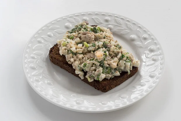 ШАГ 4 Бородинский хлеб нарезать ломтиками, поджарить на сухой сковороде или в тостере и выложить сверху рис с рыбой.