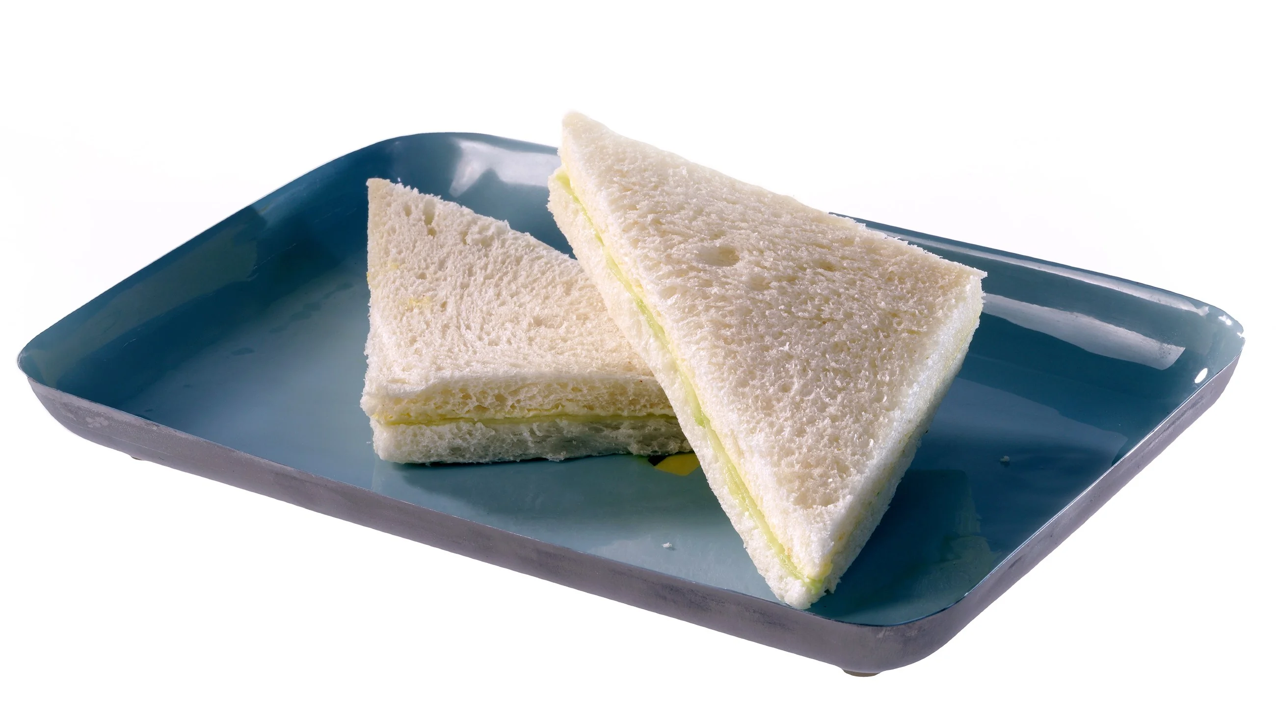 ШАГ 5 Накрыть сэндвичи оставшимися кусками хлеба, выложив их маслом вниз. Острым ножом обрезать у сэндвичей корки, затем нарезать их на треугольники, два раза разрезав по диагонали.