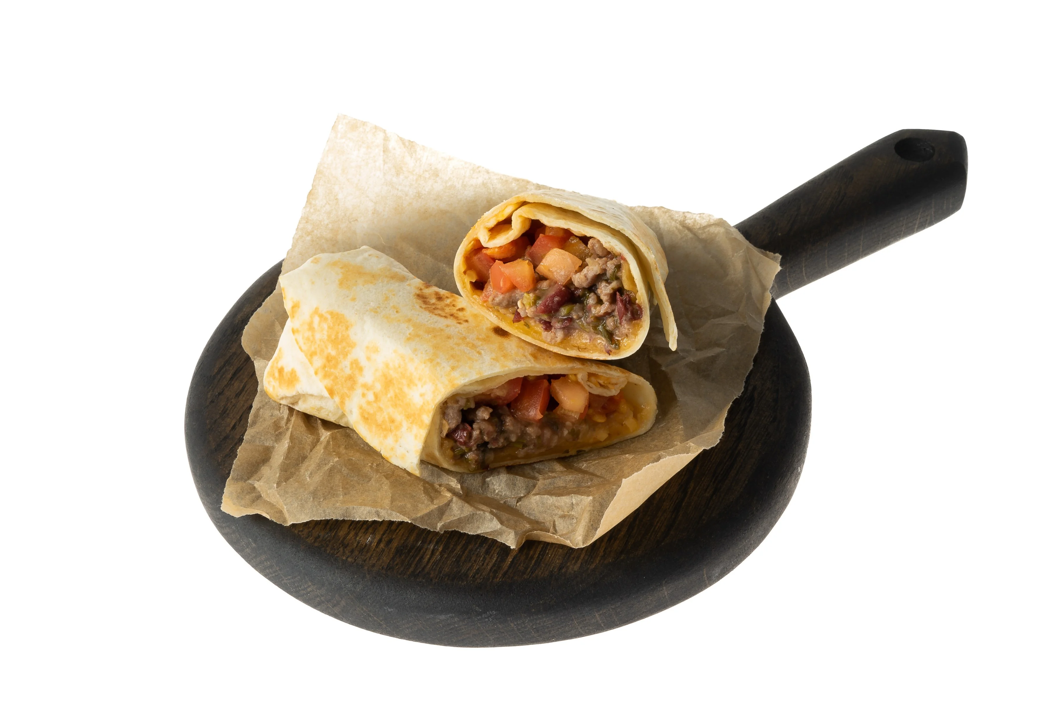 ШАГ 6 На сухой сковороде подогреть тортилью по 30 секунд с каждой стороны. На теплую тортилью выложить тертый сыр, мясо с фасолью, нарезанные кубиками помидоры. Сложить верхний и нижний концы буррито, а затем скрутить его.