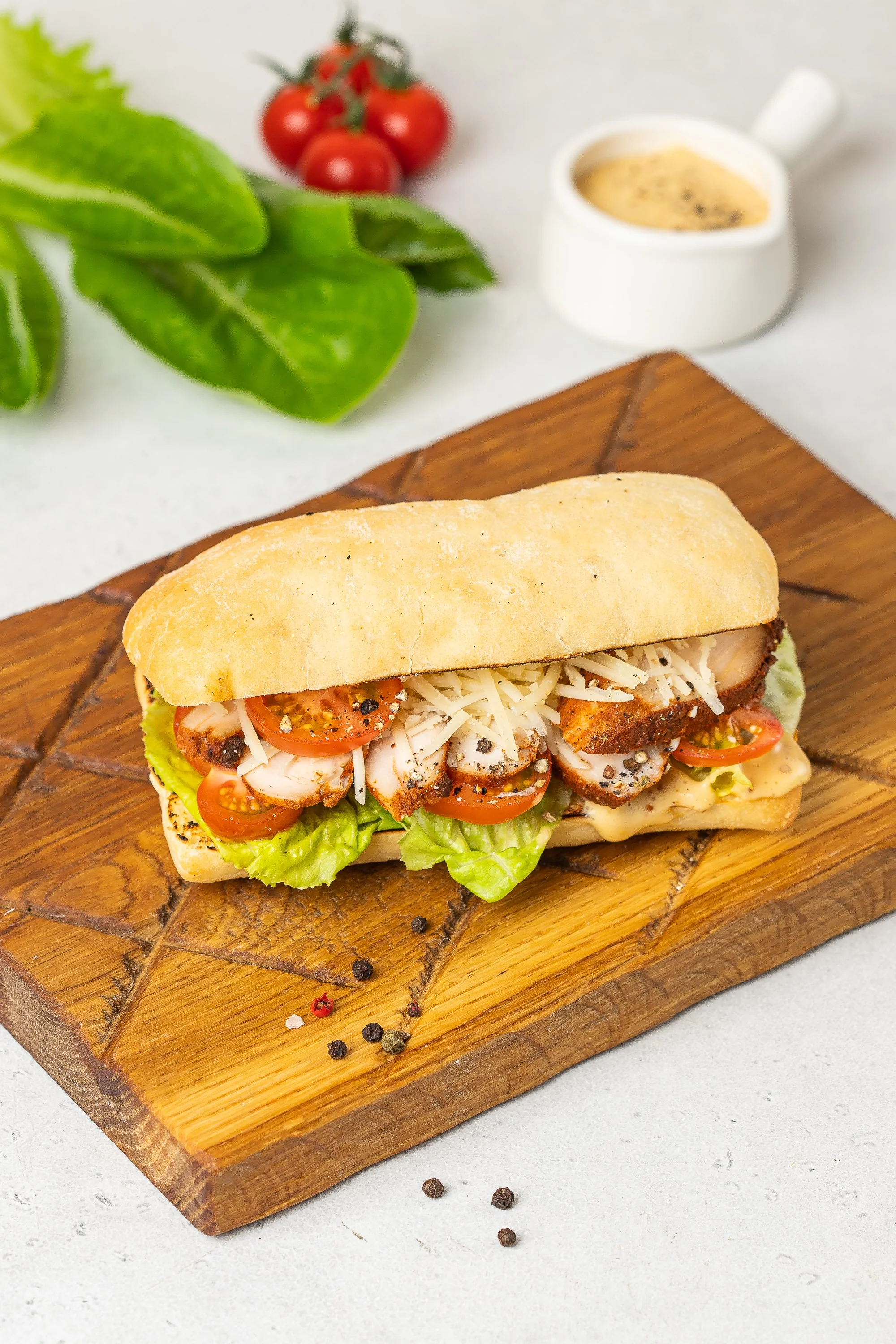 ШАГ 7 Овощи выложить на чиабатту, сверху — ломтики пастромы из курицы и посыпать сыром пармезан.