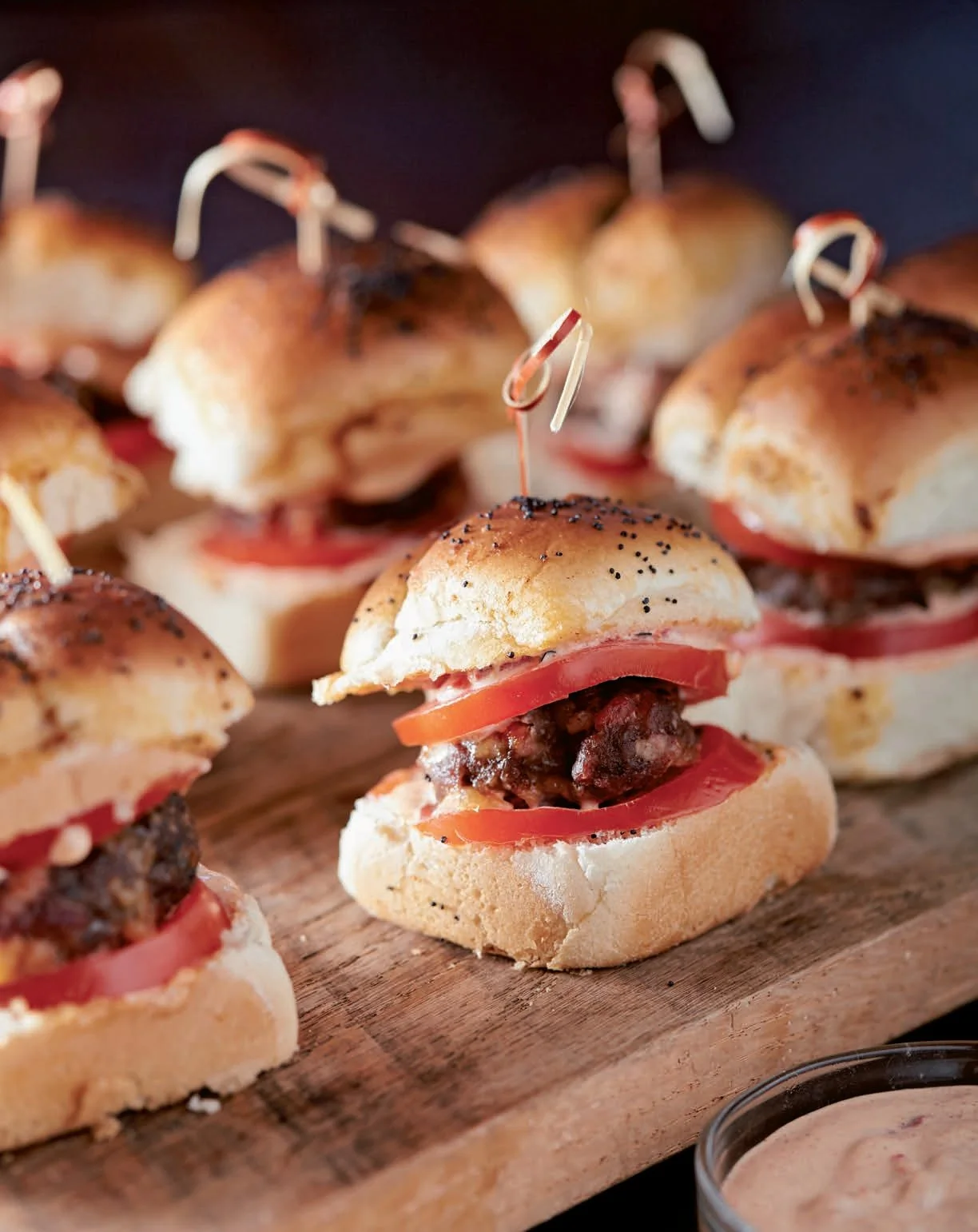 ШАГ 10 Булочки разрезать и смазать все половинки перченым майонезом. На нижнюю часть булочек выложить кружок томата, затем котлетку и еще один кружок томата. Накрыть верхней частью булочки. При желании скрепить бургеры коктейльной шпажкой.