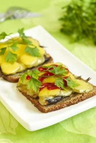 ШАГ 2 Раздавить чеснок в майонез и намазать хлеб этой смесью. Сверху положить шпроты (2-3 шт., в зависимости от размера хлеба), кусочек маринованного огурца, кусочек сыра и половинку кружочка лимона.
