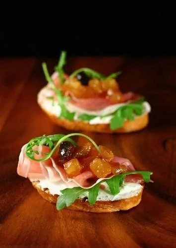ШАГ 2 Разрежьте каждый кусок прошутто на 4 части и выложите на каждый тост по 2 кусочка. Сверху положите небольшое количество инжирного джема и посыпьте перцем. Украсьте рукколой.