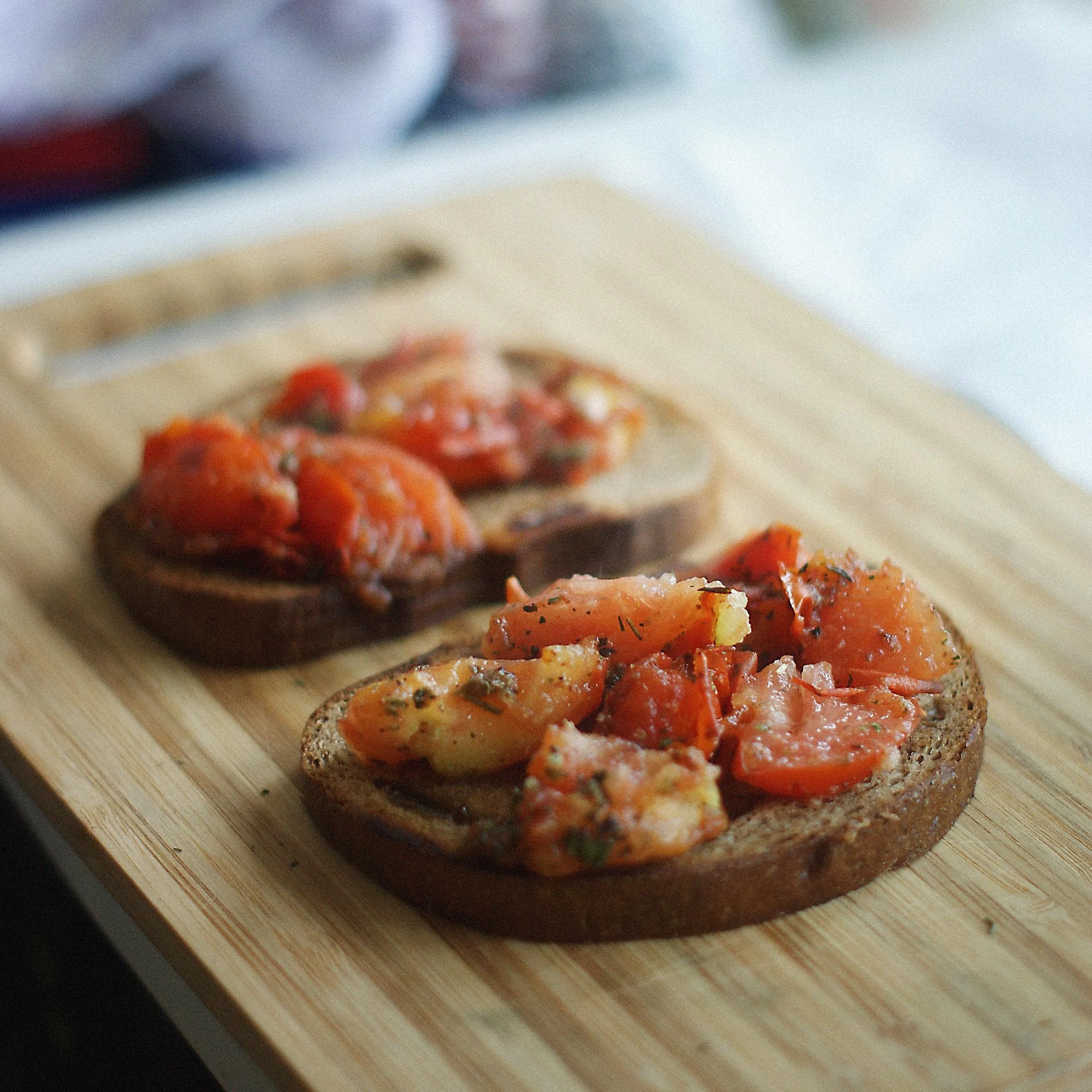 Чесночная брускетта с томатами, красным луком и базиликом