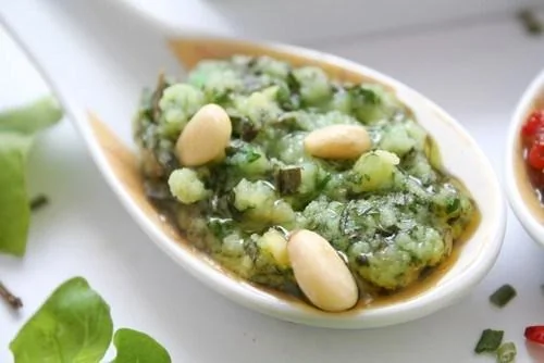 Морская соль Перец черный молотый Базилик Оливковое масло extra virgin Кедровые орехи Тертый сыр пармезан Лимон Чеснок Соусы и маринады Итальянская кухня Соус «Песто»
