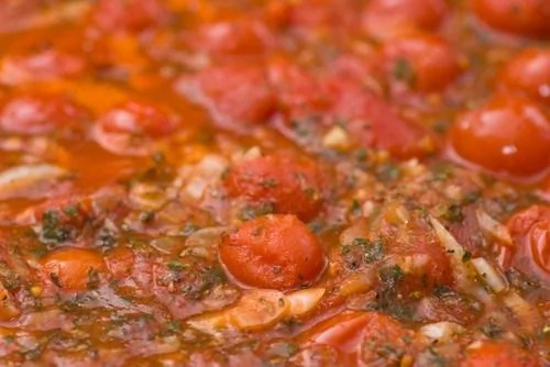 ШАГ 1 Разогрейте оливковое масло в небольшой кастрюле на среднем огне и добавьте измельченный чеснок. Слегка обжарьте, не давая подрумяниваться, и добавьте нарезанные томаты. Сделайте сильный огонь, дайте закипеть, затем сделайте маленький огонь.