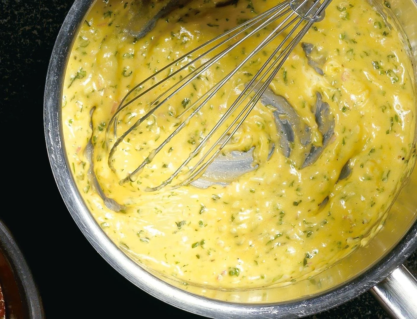 ШАГ 3 Три яичных желтка и две столовые ложки воды взбить венчиком в эмульсию. Вмешать половину выпаренного лука. На паровой бане — можно просто держать миску над кастрюлей с кипящей водой — взбивать соус минут пять, пока по консистенции он не будет напоминать пену для бритья. Важно не перегреть — чтобы не получился омлет, так что можно время от времени снимать миску с пара.