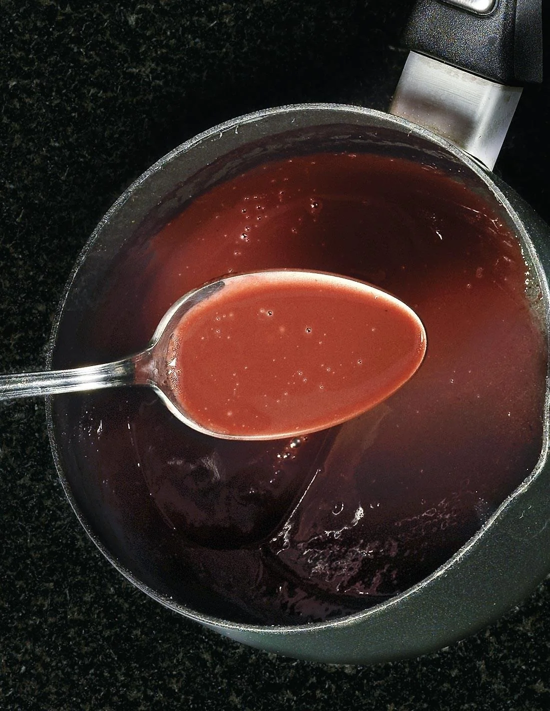 ШАГ 3 Процедить соус через мелкое сито в другой сотейник. Поставить его на огонь. Разделить масло на пять-шесть кусков и по одному добавлять в вино, после каждой порции слегка вращая сотейник на огне, пока масло не растворится.