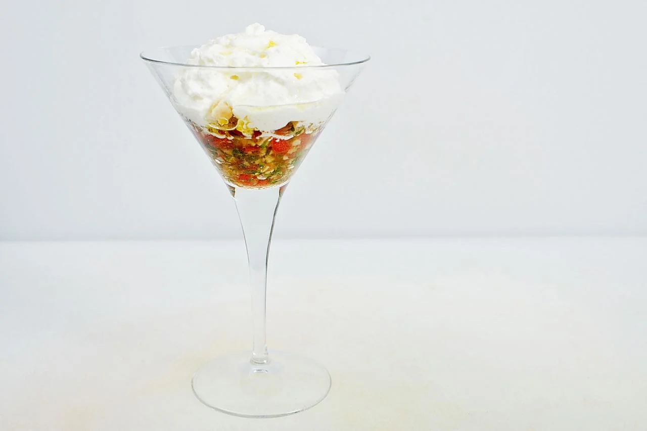 ШАГ 4 Разложить тартар из помидоров с оливками и базиликом по бокалам для мартини. Затем — немного крутонов. Впрочем, крутоны — это уже дело добровольное, можно вполне обойтись и без них.