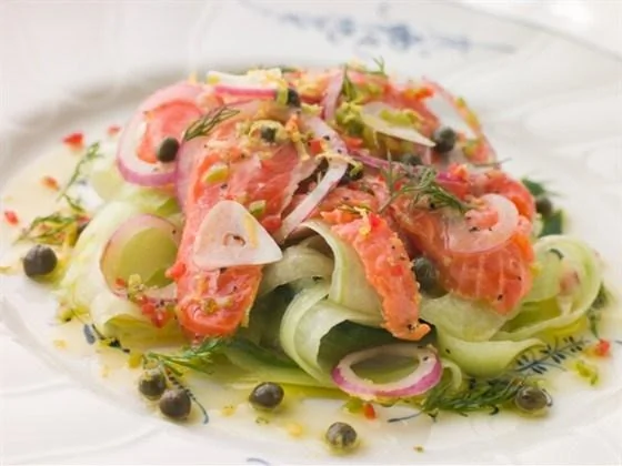 ШАГ 3 Рыба побелеет, затем добавляют: репчатый лук соломкой, морковь соломкой, обязательно чеснок мелкокрошенный, красный жгучий перец (молотый), черный перец, огурец свежий соломкой, кинзу (кориандр) и зеленый лук мелкопорезанный. И кто желает — добавляет соевый соус.