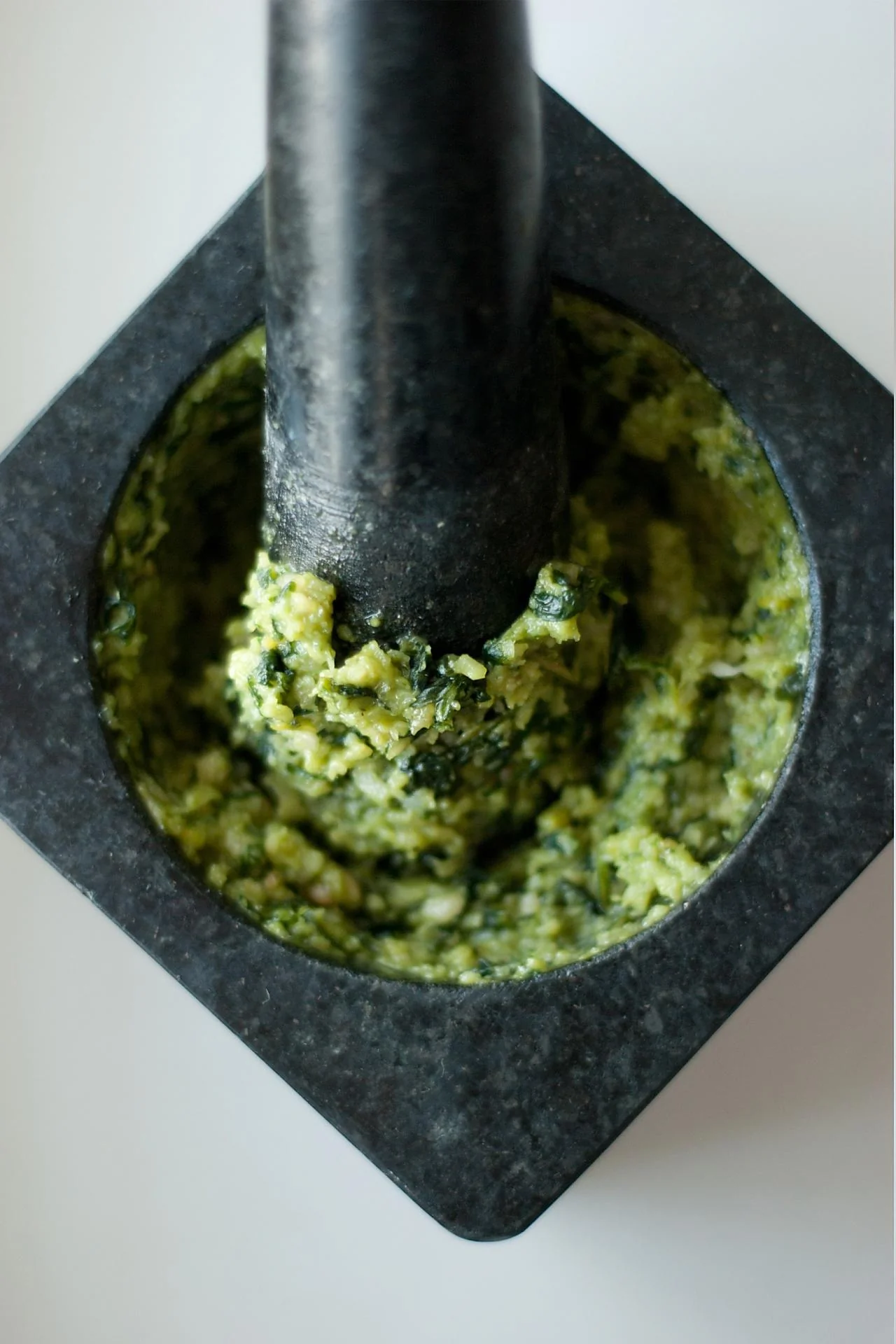 ШАГ 1 Растолочь в ступке чеснок и пару щепоток соли, добавить листья базилика, растолочь.