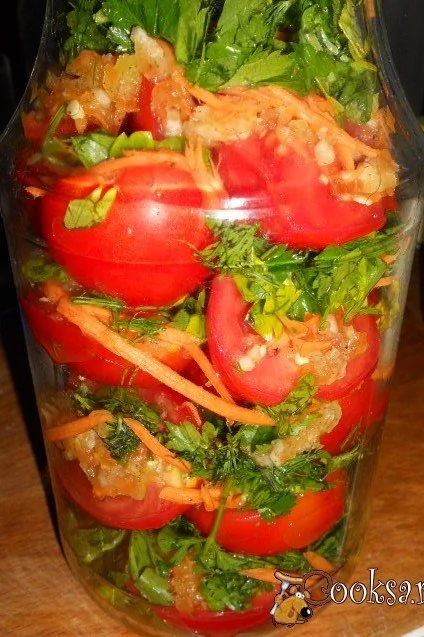 ШАГ 5 В банку выкладывать слоями: половинки помидоров, срезом вверх, далее чеснок с перцем, морковь, зелень.
