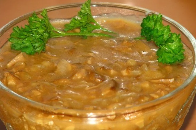 ШАГ 2 Муку с 1 столовой ложкой масла прожарьте до светло-коричневого цвета и разведите 2 стаканами горячего процеженного грибного бульона.