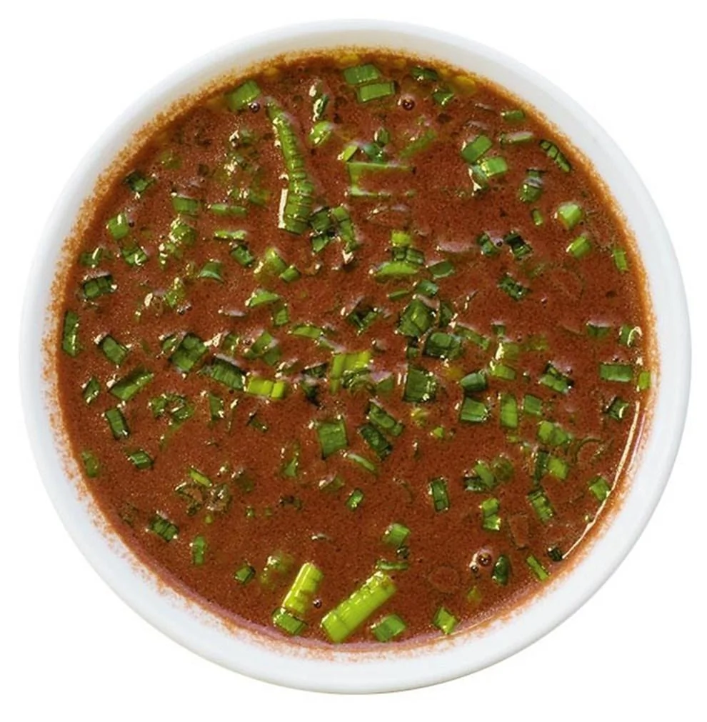 ШАГ 3 Венчиком взбить соус с замороженными мелкими кубиками сливочного масла, отчего у соуса появится глянцевитость, посолить, поперчить и посыпать рубленым зеленым луком.