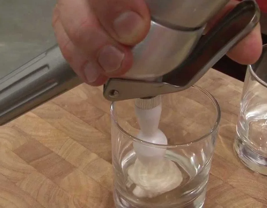 ШАГ 7 Переложите соус в сифон для взбивания остудите почти до комнатной температуры. Закрутите сифон заправьте 1-2 баллончиками встряхните 5-6 раз положите в холодильник минимум на 20 минут.