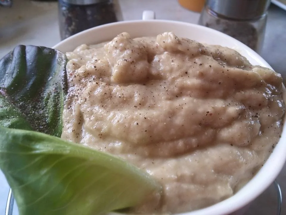 ШАГ 2 Когда остынут, очистить. В блендер добавить половину луковицы 2-3 зубчика чеснока и измельчить, добавить баклажаны и продолжать блендеровать добавляя горчицу, соль, сахар и уксус.