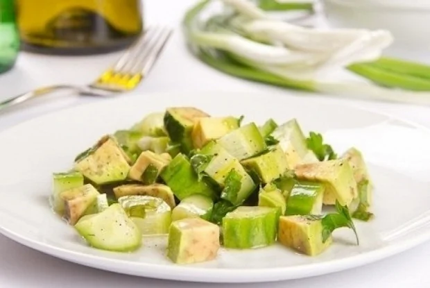 ШАГ 1 Огурец и целый авокадо порезать. Укроп и чеснок измельчить.