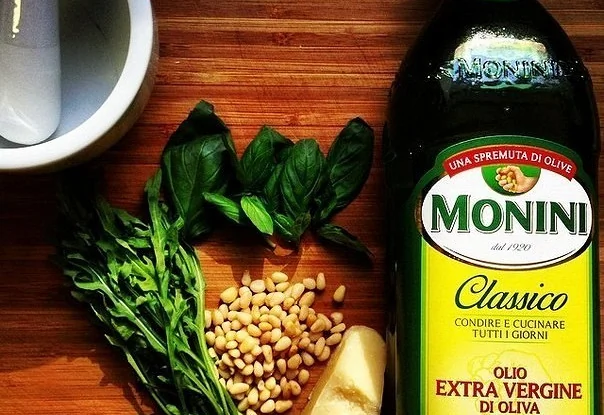 ШАГ 1 В ступке размельчаем базилик и кедровые орешки