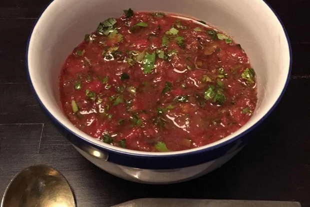 ШАГ 1 Порубите и смешайте в чаше томаты, томатное пюре, базилик, пудру и уксус.