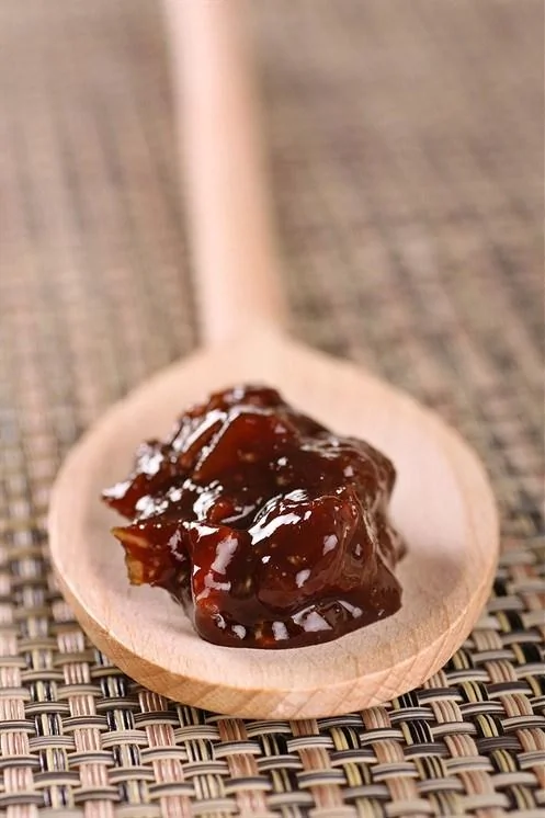 ШАГ 9 Если вы хотите, чтобы фрагменты лука, чеснока, слив и чили чувствовались, оставьте все как есть. В противном случае измельчите все блендером. Хранить в простерилизованных банках в холодильнике.