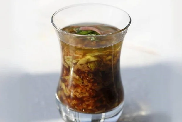 ШАГ 6 Добавьте 100 мл овощного бульона, 4 ст. ложки устричного соуса, 2 ст. ложки рисового уксуса, 1 ч. ложку сахарной пудры, имбирный сок и нарезанный соломкой имбирь. Перемешайте и доведите до кипения.