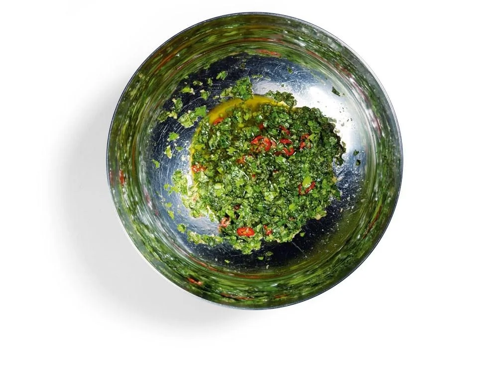 ШАГ 1 Чеснок и мелко нарезанный имбирь раздавить в ступке до состояния пасты, смешать с оливковым маслом, хересным уксусом, солью, черным молотым перцем, медом и лимонным соком. Кинзу и базилик крупно нарубить и смешать с соусом, добавить тонко нарезанный перец чили и опять перемешать.