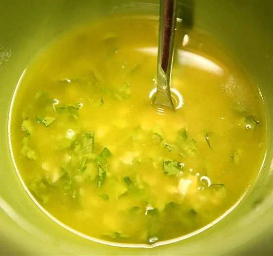 ШАГ 1 В небольшой миске смешайте масло, уксус, измельченный чеснок и соль по вкусу.