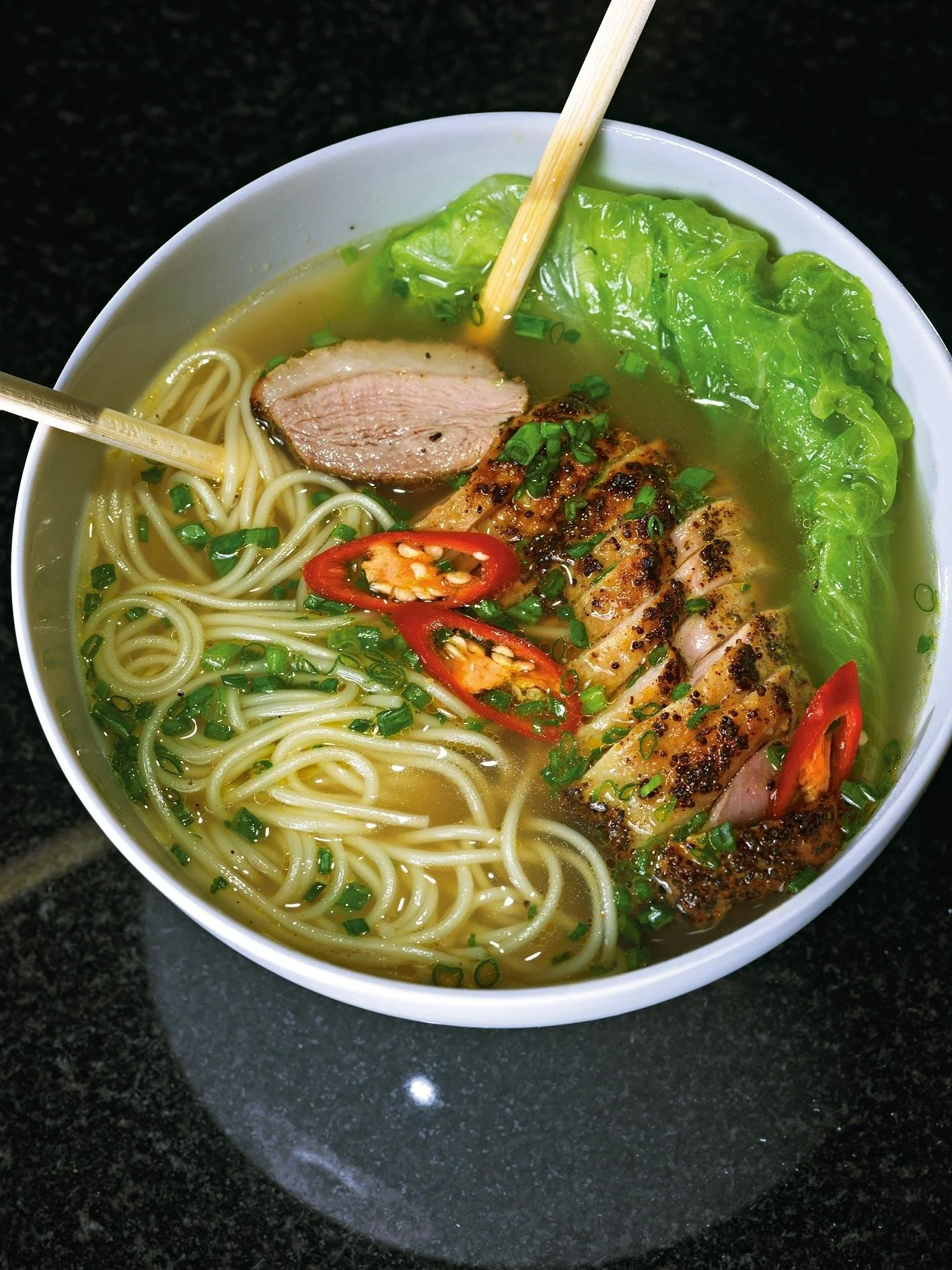 ШАГ 5 Выложить в глубокую тарелку капусту, лапшу и тонко нарезанную утку. Залить бульоном, посыпать мелко нарубленным зеленым луком и парой тонких колечек чили.