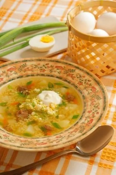 ШАГ 5 Перед тем как снять суп с плиты, заправьте его тушеным зеленым луком и чесноком. Перед подачей положите в каждую тарелку щепотку рубленого яйца.