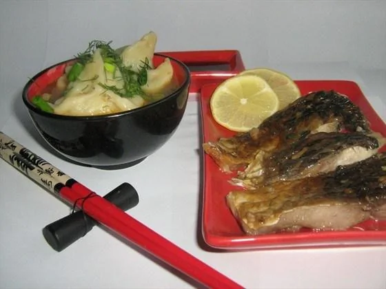 ШАГ 18 На отдельную тарелку кладем кусочки рыбы вместе с соусом. Посыпаем зеленью и украшаем дольками лимона (или так: в глубокие пиалы кладем пельмени, кусочек рыбы, заливаем бульоном, добавляем по вкусу лимонный сок и посыпаем зеленью).