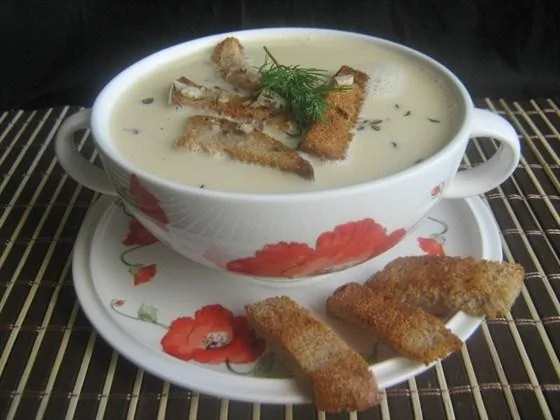 ШАГ 5 В порционную тарелку налить суп, положить несколько сухариков, украсить веточкой зелени.