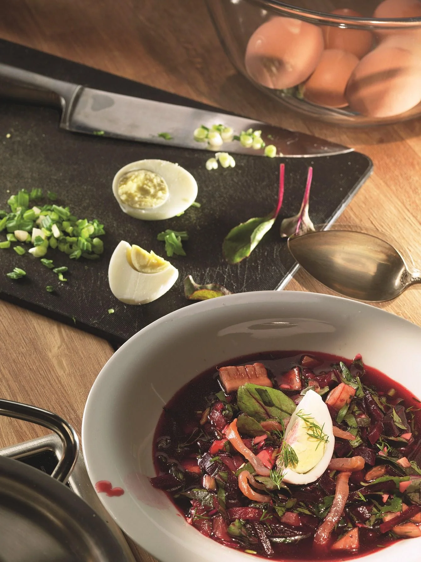 ШАГ 5 Овощи, зелень и яйца перемешать и залить пополам — свекольным отваром и квасом, перемешать, добавить толченое филе анчоусов, посолить и поперчить, если нужно.