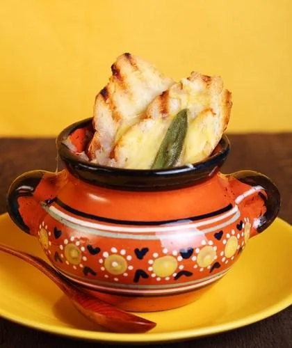 ШАГ 4 Можно влить вино шабли и готовить еще 2 минуты. Приправить солью и перцем. Разлить суп в глубокие глиняные горшочки, положив сверху ломтики поджаренного хлеба и посыпав их мелко натертым твердым сыром. Поставить в духовку, чтобы сыр расплавился.